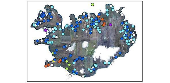 Map of power plants in Iceland. Orange dots = geothermal power plants. Dark blue dots = hydroelectric power plants. Bright green dots = wind turbine power plants. Yellow dots = solar power plants. Purple dots = petroleum-based power plants. Pale blue dots = home power plants. White dots = backup power plants. Map data obtained from Government of Iceland.