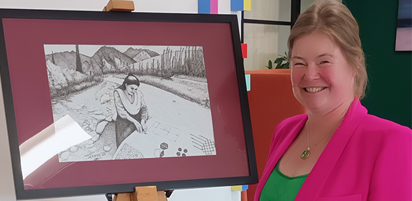 The portrait of Sabuhi by scientist-artist Dr Tennie Videler shows her amid the Hunza Valley of Pakistan, where she grew up, with design sketches in hand. The inclusion of three lions visible on the University's Coat of Arms point to Sabuhi’s global journey and personal support system – namely her father, husband and brothers. “It’s a portrait of a woman building, not just buildings, but possibilities,” says Dr Videler, who used pen and ink to create the A3-sized artwork.