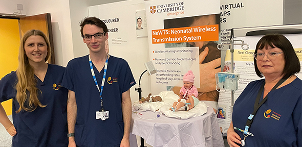Co-authors Dr Joana Warnecke (left) and Dr Alex Grafton demonstrating wireless vital sign monitoring of premature babies alongside a staff member from Cambridge Newborn Research.