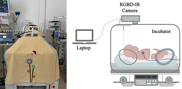 [LEFT] Experimental setup in the NICU, showing a covered incubator with the camera visible through the hole in the cover. [RIGHT] Schematic diagram of the recording setup