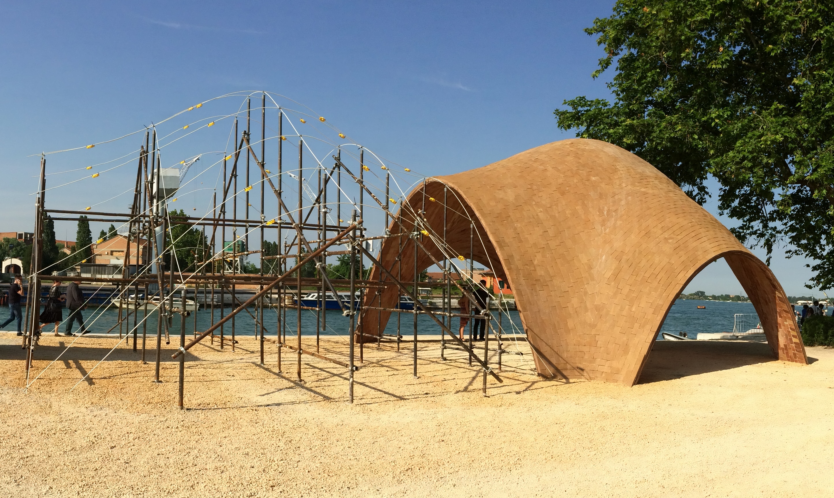 The prototype presented at the Venice Biennale is a first iteration to test the key engineering and architectural elements of such a building. The essential characteristic of the tile vault is again an efficient structural form to minimise materials. However, the efficient design also enables the structure to be built without formwork. Only fibre-glass splines are used to guide the mason; the structure is self-supporting during the entire construction process, which minimises costs. The use of locally available non-fired soil bricks also reduces the carbon footprint and the need to import large amounts of expensive materials such as steel or cement. Finally, the design will be made available as a kit, a kind of construction manual that allows for the safe transfer of technology and the employment and training of local workers in the construction of their own structures.