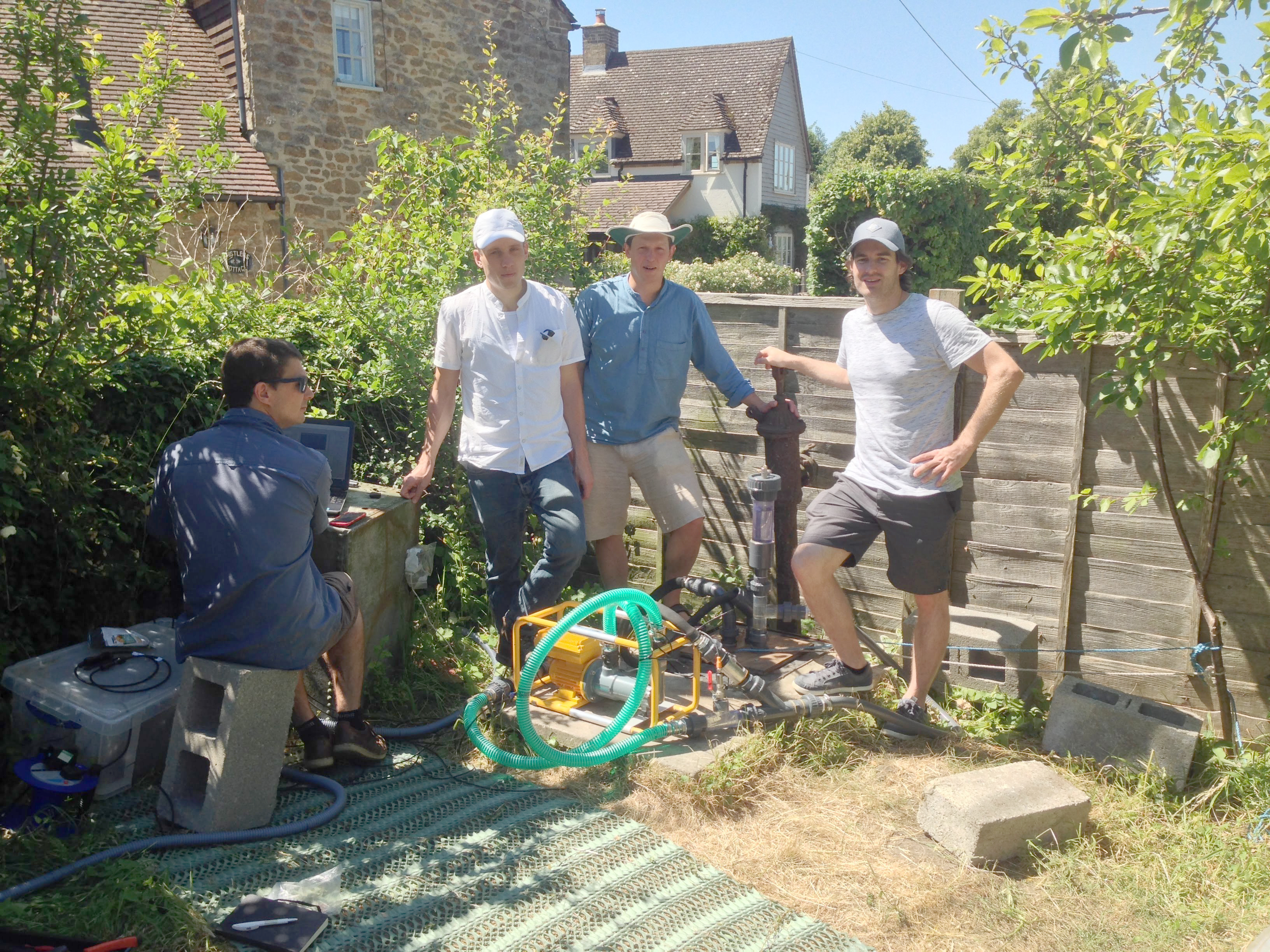 Tom and Tom Law (former CUED research student of Ann Dowling in the foreground), with friend and colleague Christoph Giger from Ennos, Switzerland. Setting up a pump test in a Victorian brick-lined test well in Beckley, Oxfordshire, June 2018.